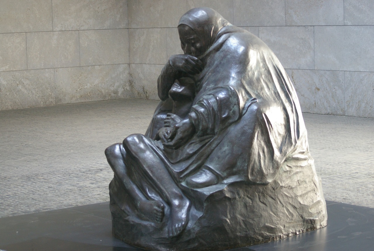 It is really just a single room, containing a single sculpture, an enlarged version of Käthe Kollwitz’s Mother with her Dead Son. The sculpture is directly under the oculus ( a round, eye-like opening in the roof ), and so is exposed to the rain, snow and cold of the Berlin climate, symbolising the suffering of civilians during World War II.?