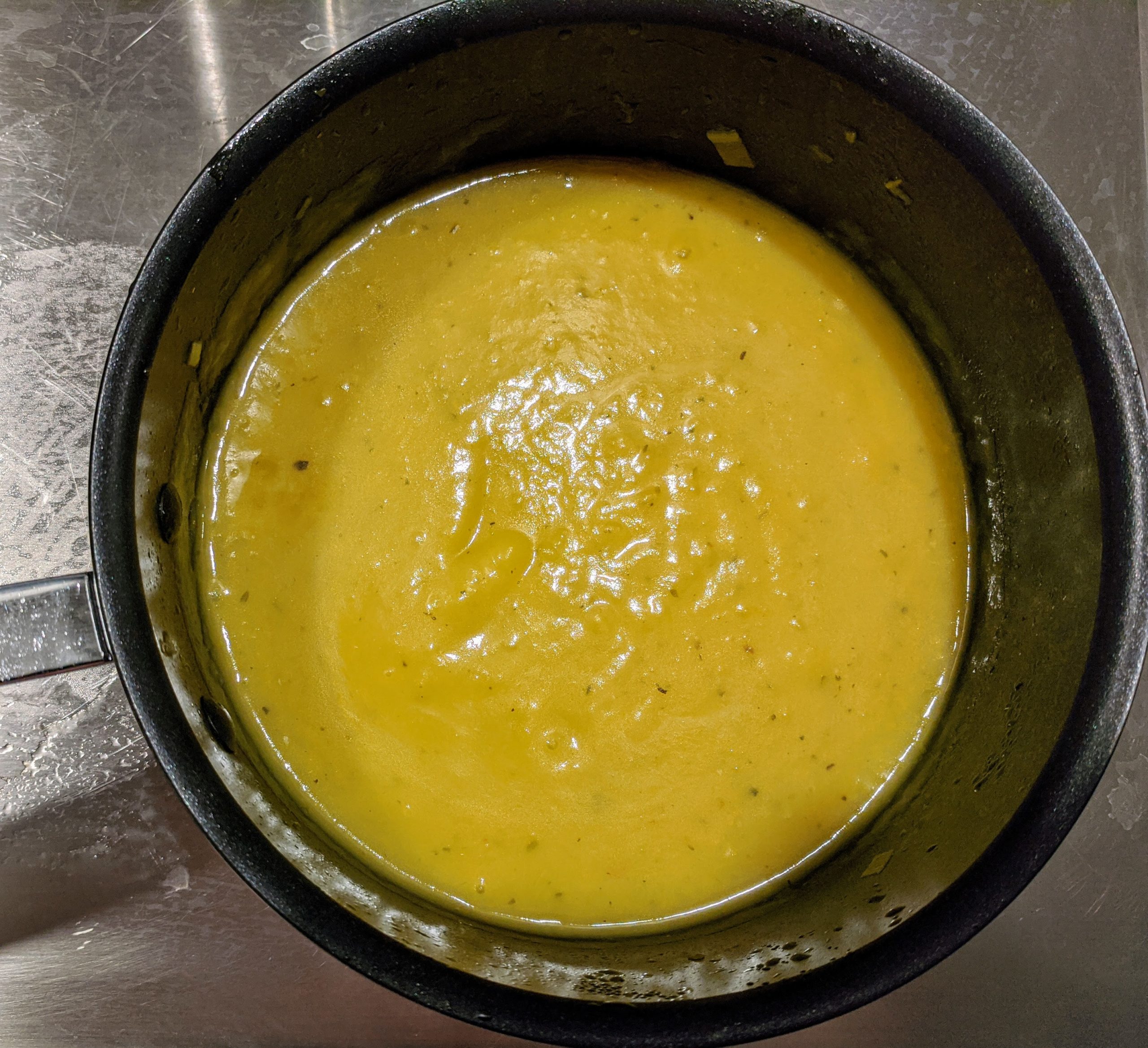 - Add the vegetable stock and the coconut milk and season with the salt and pepper.