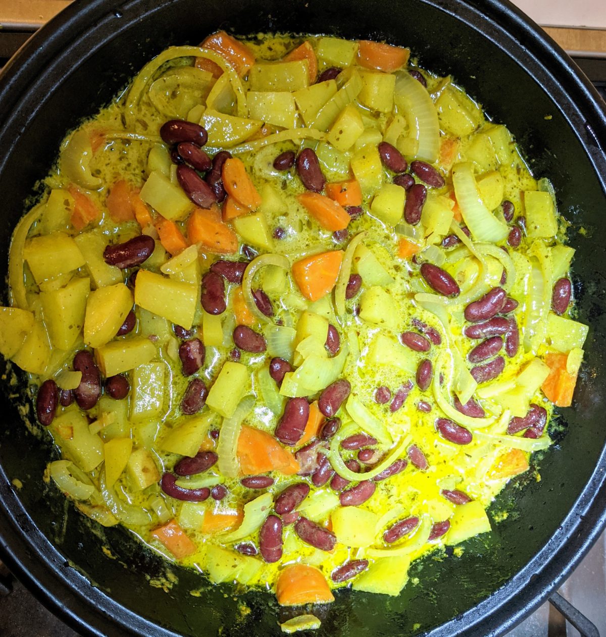 - Add the other can of beans, the can of tomatoes and the potato, cauliflower and carrots and mix