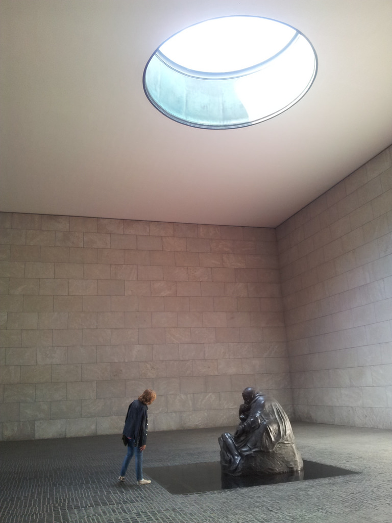 It is really just a single room, containing a single sculpture, an enlarged version of Käthe Kollwitz’s Mother with her Dead Son. The sculpture is directly under the oculus ( a round, eye-like opening in the roof ), and so is exposed to the rain, snow and cold of the Berlin climate, symbolising the suffering of civilians during World War II.?