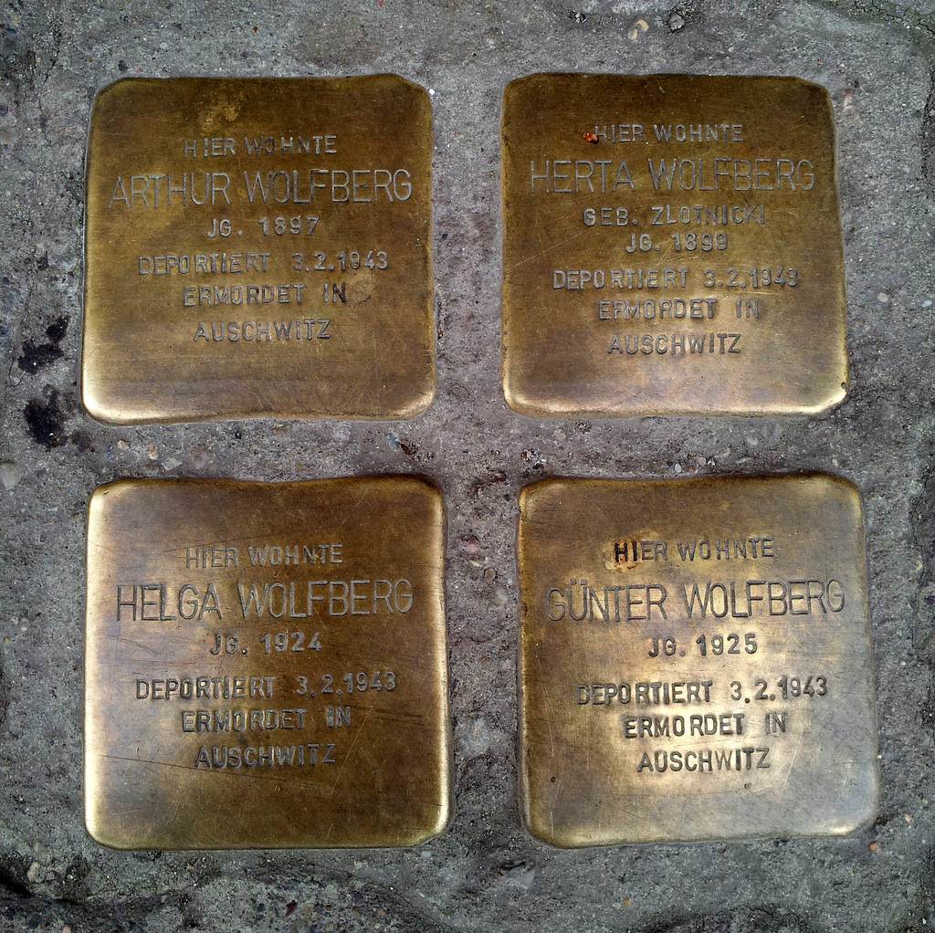 In the Stolpersteine in the footpaths outside many buildings in Berlin are such simple but poignant stories. This collection of four is outside a building in Danzigerstrase, Prenzlauer. The information relates to a Jewish family that lived in the adjacent house. Arthur Wolfberg, born 1897 (by inference the father), Herta Wolfberg born 1899 (by inference the mother, Helga Wolfberg born 1924 (daughter?) and Gunter Wolfberg born 1925 (son?). All deported 3 February 1943, all murdered in Auschwitz. http://bit.ly/1miyZ8Z