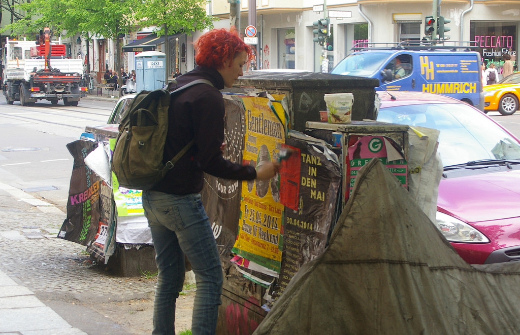 Putting up flyers with a can of glue and paste brush in hand this woman was moving down Wuhlischstrasse sticking flyers to posts and signal boxes. (You’ll need to excuse the pun in the title 🙂 )