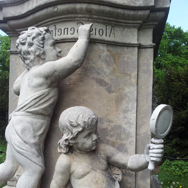 The next closest U-bahn stop to where we are staying is Senefelderplatz. Named after the inventor of lithography, nearby is a marble statue of him. I thought naming it with the sort of mirror reversed lettering lithography uses, and having one of the putti looking at it with a mirror a nice touch. #sculpture Alois Senefelder